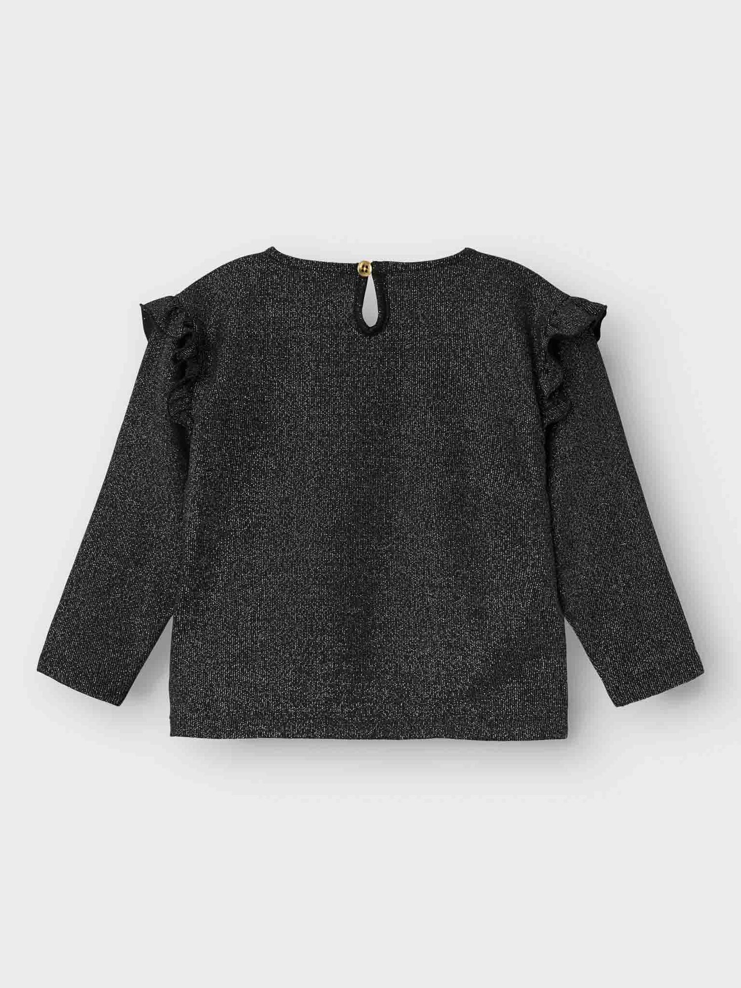 Mettez à jour la garde-robe de votre enfant avec des hauts cool et amusants, parfaits pour la vie de tous les jours et les occasions spéciales. Le tissu pailleté possède un effet brillant et chatoyant pour un look glamour. - Type d'article : T-shirt - Col : Col rond - Manches : Manches longues - Fermeture : Fermeture à boutons et à boucles - Détails : Volants - Coupe : Regular Fit